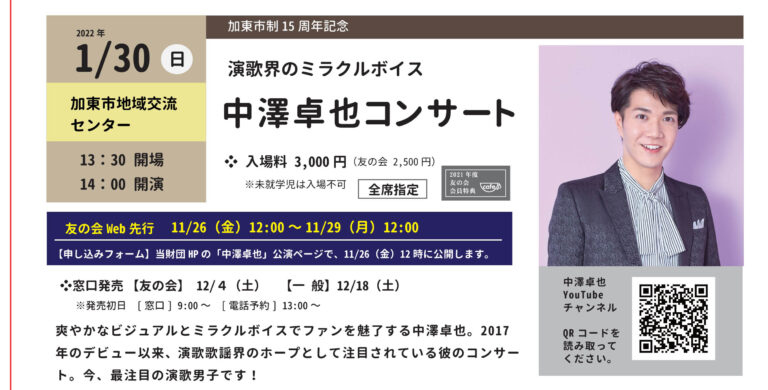 ◇イベント開催のお知らせ◇2022年1月30日(日) 加東市制15周年公演 「演歌のミラクルボイス 中澤卓也コンサート」(兵庫・加東市)