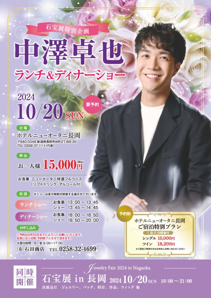 ◇出演のお知らせ◇10月20日(日)石宝展特別企画『中澤卓也ランチ&ディナーショー』(新潟・ホテルニューオータニ長岡)*9/25追記あり