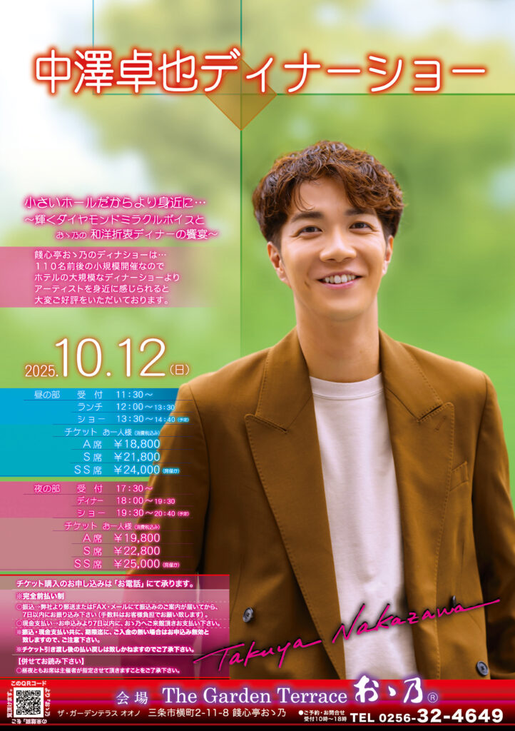 ◇開催のお知らせ◇10月12日(日)『中澤卓也ディナーショー』(新潟・The Garden Terrace おゝ乃)