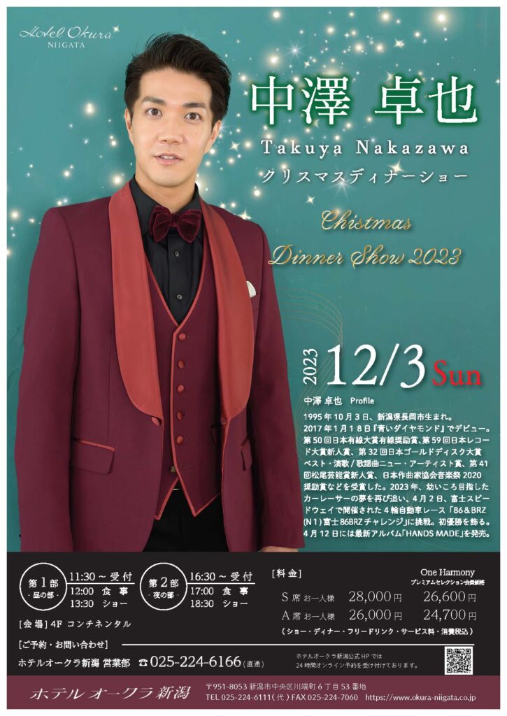 ◇開催のお知らせ◇12月3日(日)『中澤卓也 クリスマスディナーショー2023』(新潟・ホテルオークラ新潟)