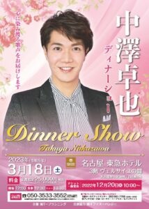 ◇開催のお知らせ◇3月18日(土)「中澤卓也 DINNER SHOW」(愛知・名古屋東急ホテル)
