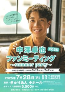 ◇開催のお知らせ◇7月28日(月)『中澤卓也 ファンミーティング2025~summer party~』(東京・きゅりあん 小ホール)