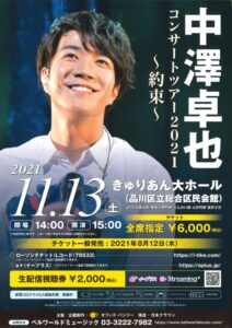◇チケット一般販売開始:8月12日(木)~ ◇<東京・きゅりあん>「中澤卓也コンサートツアー2021 ~約束~」ファイナル