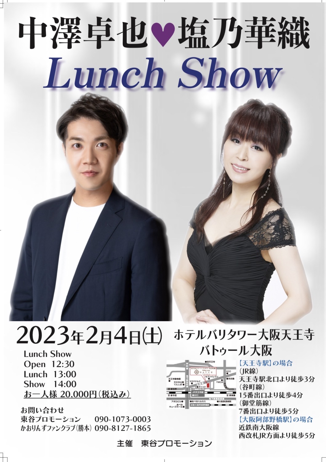◇出演のお知らせ◇2月4日(土)『中澤卓也・塩乃華織 Lunch Show』(大阪・ホテルバリタワー大阪天王寺(バトゥール大阪))