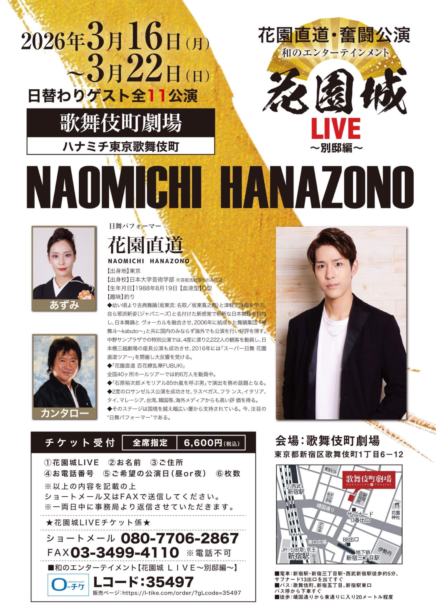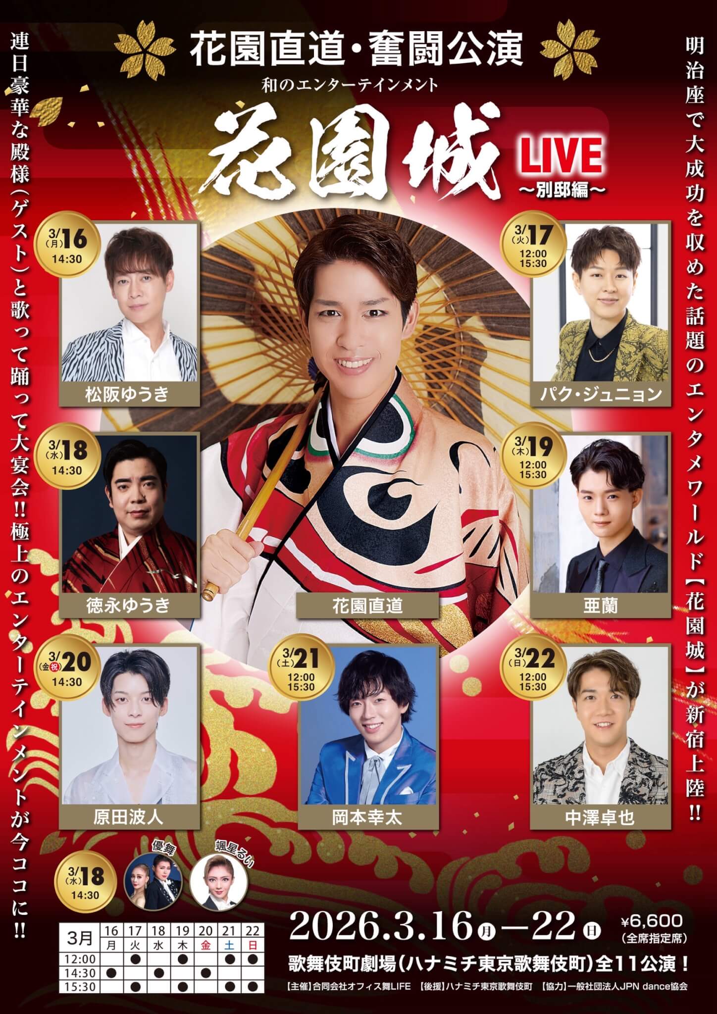 2026年3月16日〜22日開催の 『-花園直道奮闘公演-和のエンターテインメント 「花園城LIVE~別邸編」』に22日(日)